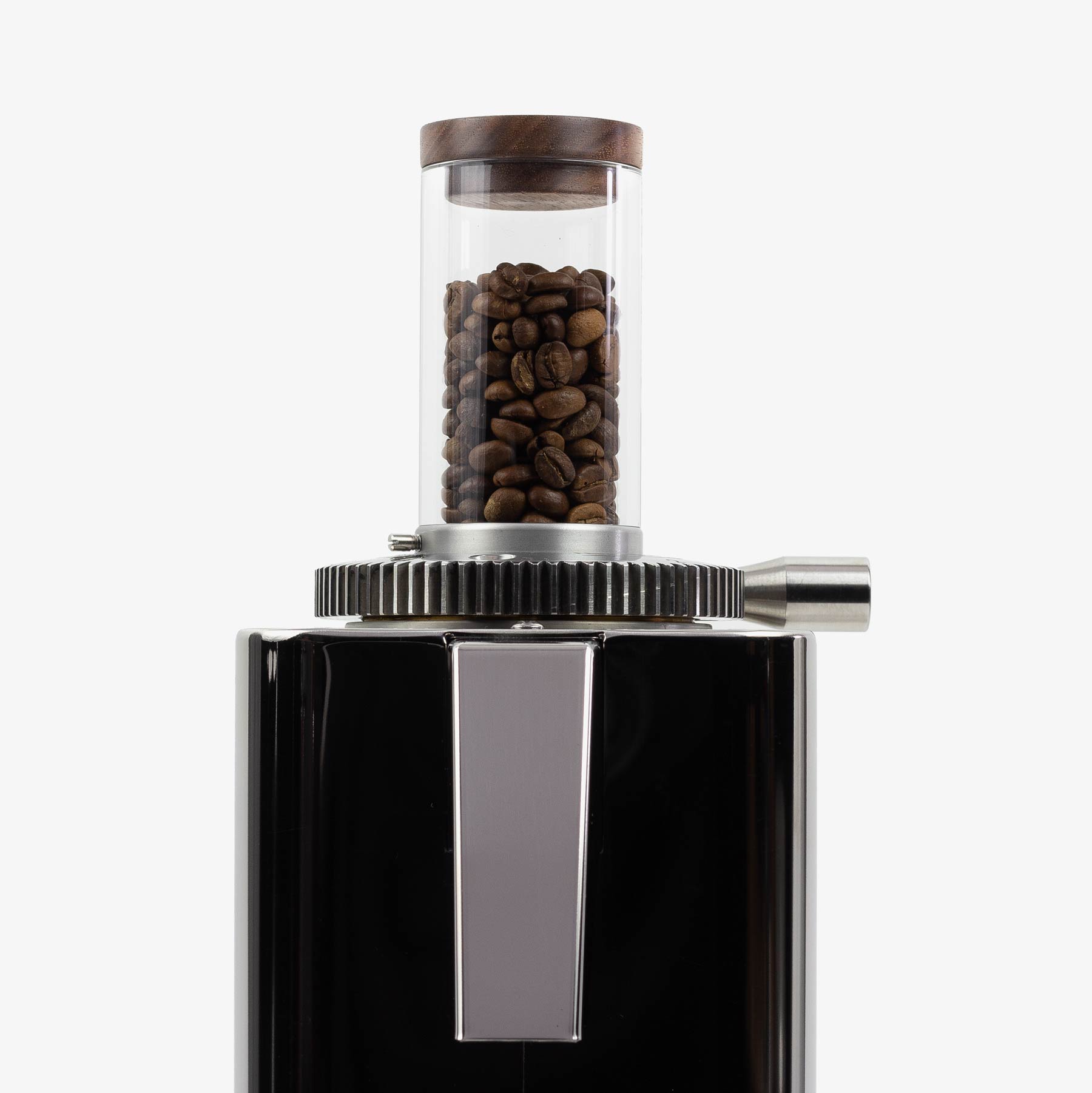 Spiegelpolierter Acrylglaszylinder mit handgefertigtem Holzdeckel. Passend für: Alle ECM und Profitec Mühlen.