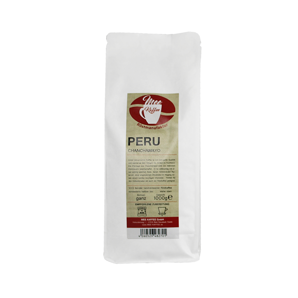 Mee Kaffee "Peru Chanchamayo" Unser peruanischer Kaffee ist von sehr guter Qualität und wächst an den Hängen der Anden im Hochland. Die Plantage des Chanchamayo wird von mehreren Kleinbauern bewirtschaftet. Er ist vollmundig mit einer würzig-weichen Note, feinen Schokoladen-Nuancen, einer angenehmen Zitrussüße im Abgang, sowie einem samtig-rauchigen Charakter. Als Espresso und Filterkaffee gleichermaßen ein Genuß.