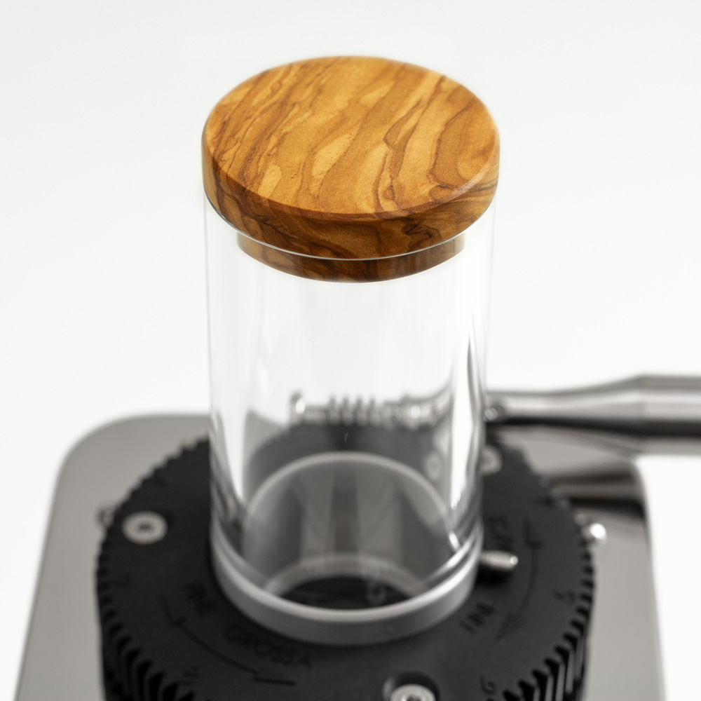 Spiegelpolierter Acrylglaszylinder mit handgefertigtem Holzdeckel. Passend für: Alle ECM und Profitec Mühlen.